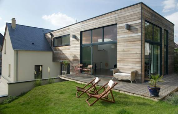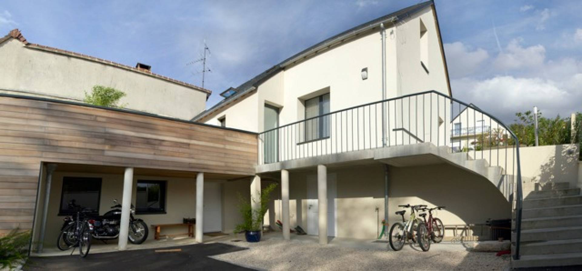 L’intérieur est sobre : parquet et carrelage avec paroi blanches sur murs et plafonds .L’extérieur est tout en bardage pour la partie extension et isolation extérieure avec enduit pour la maison existante. Une verrière vient amplifier l’apport de lumière zénithale le long du mitoyen. Il s’agit d’un mariage entre une maison initialement classique en parpaing et d’une extension en ossature bois, toit terrasse et bardage en façade. Les baies en Aluminium confèrent à ce projet une note résolument contemporaine avec des espaces intérieurs très lumineux.